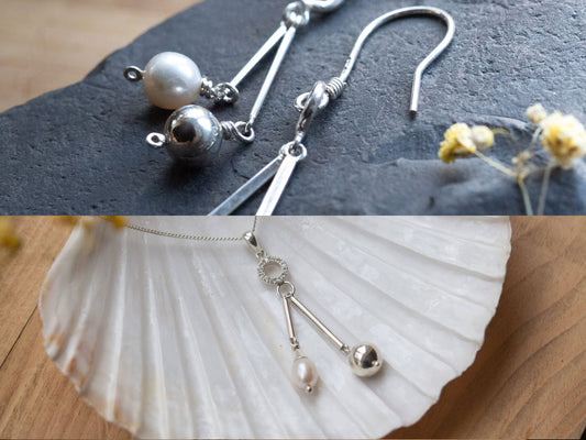 Handmade Rhodium-Plated Sterling Silver Moon & Pearl Drop Earrings/Necklace Set