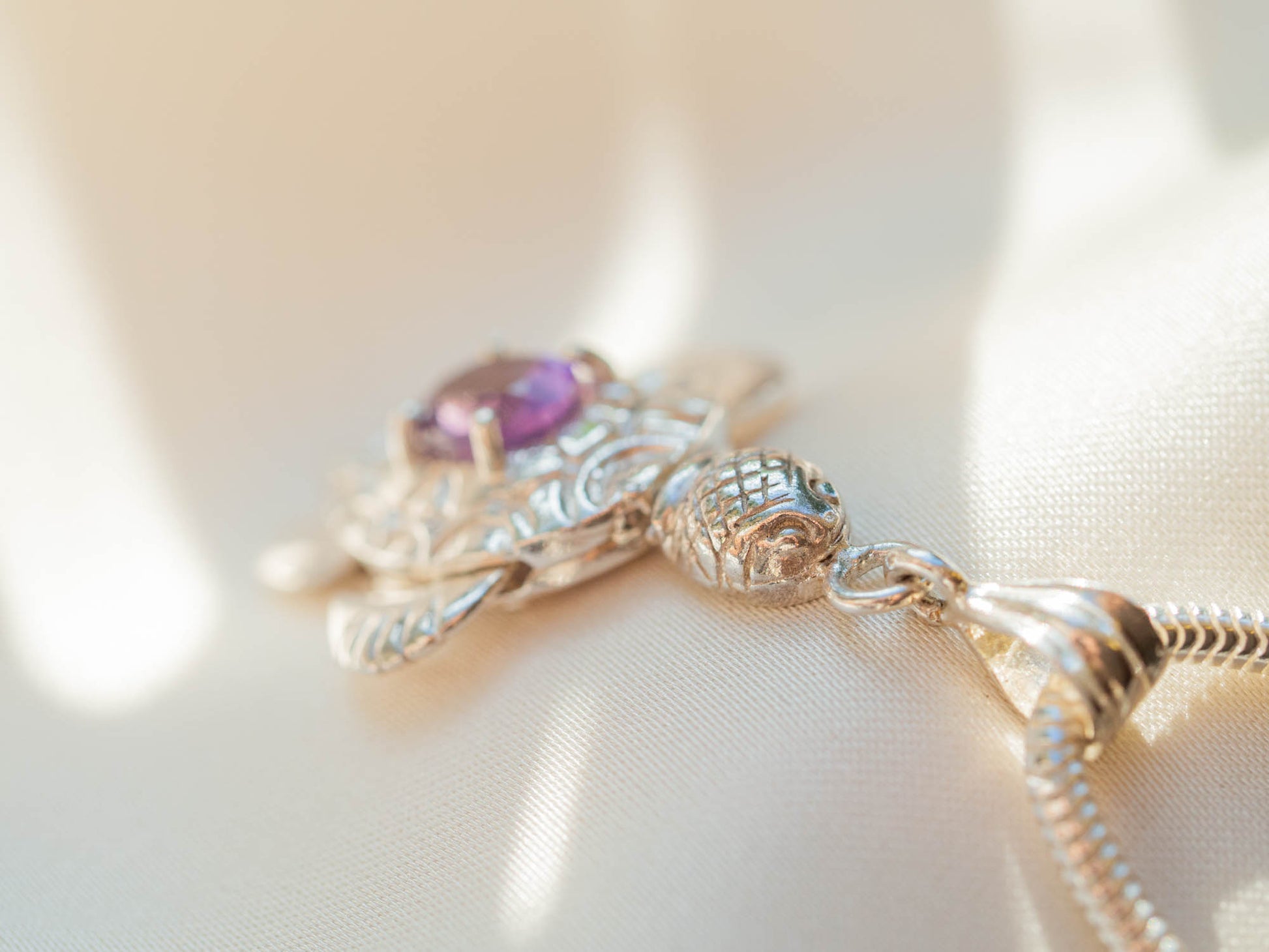 Sterling silver turtle pendant featuring a faceted amethyst stone. Symbolizes resilience and inner peace, with amethyst providing spiritual clarity. A meaningful talisman for those navigating life changes with patience and calm determination.