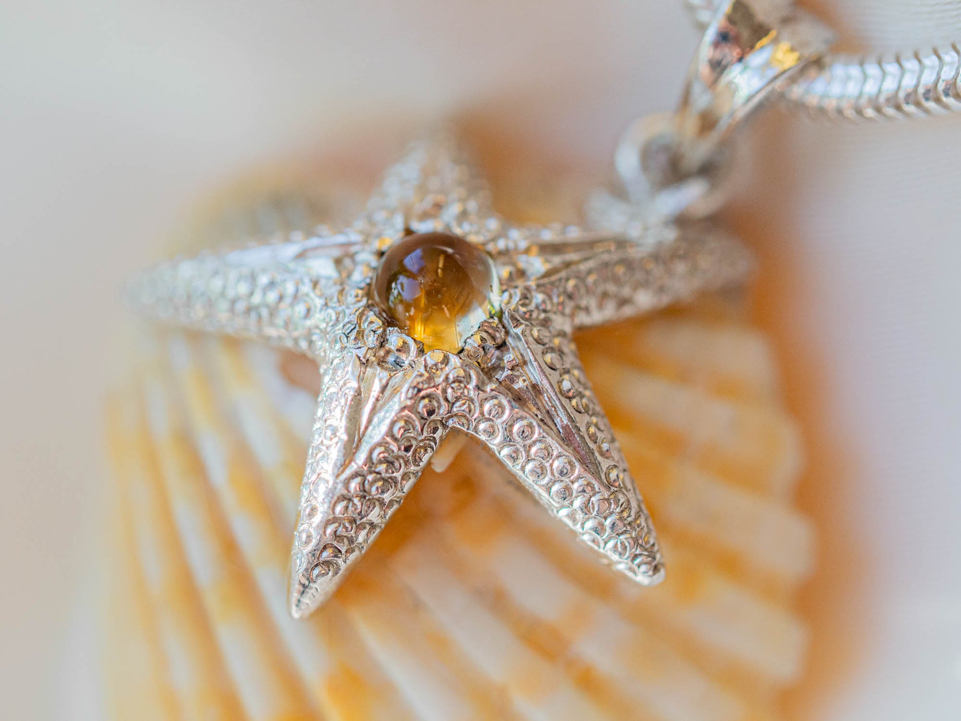 Exquisite sterling silver starfish pendant with golden citrine and complementary responsibly sourced seashell. This maritime duo symbolizes renewal and protection—the starfish representing regeneration, the seashell offering sanctuary and tranquility.