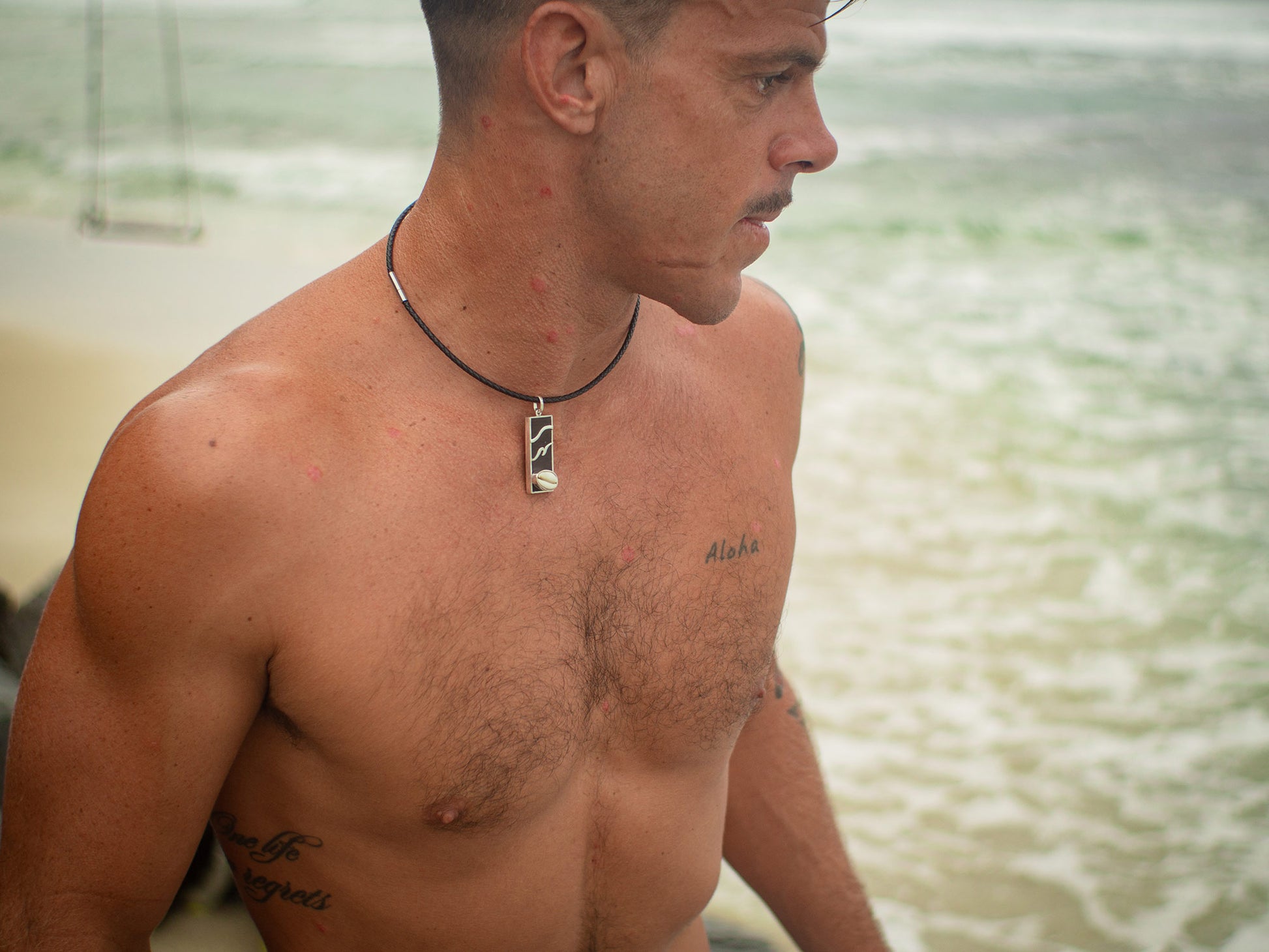 • Rectangular ebony pendant with centered shiva shell on leather. Elegant natural contrast.
