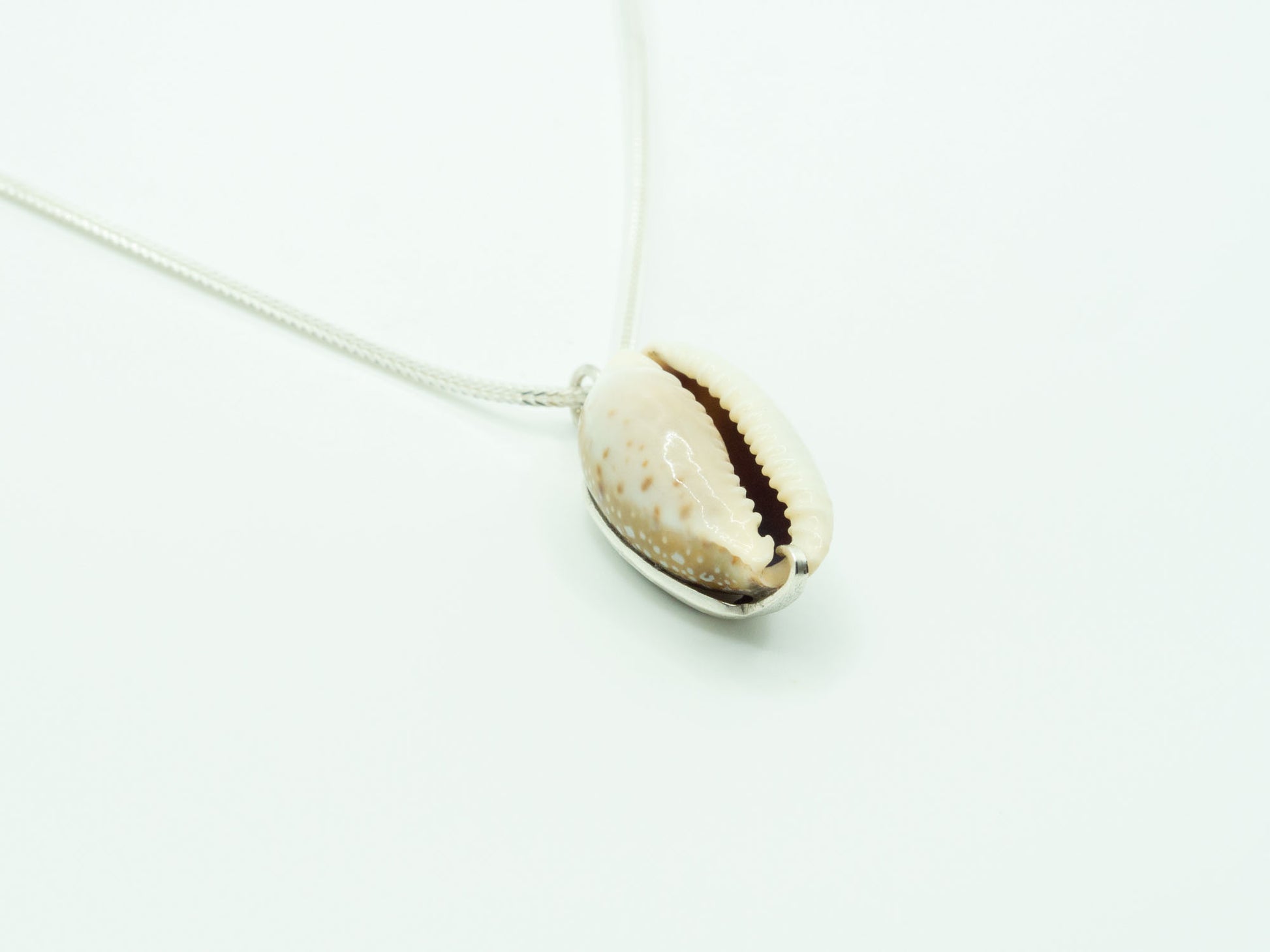 Sterling silver-edged cowrie shell pendant featuring natural patterns and earth tones. Each uniquely shaped shell symbolizes prosperity and protection across cultures. Hand-finished silver bezel enhances the shell's organic beauty, creating a wearable piece of natural artistry.